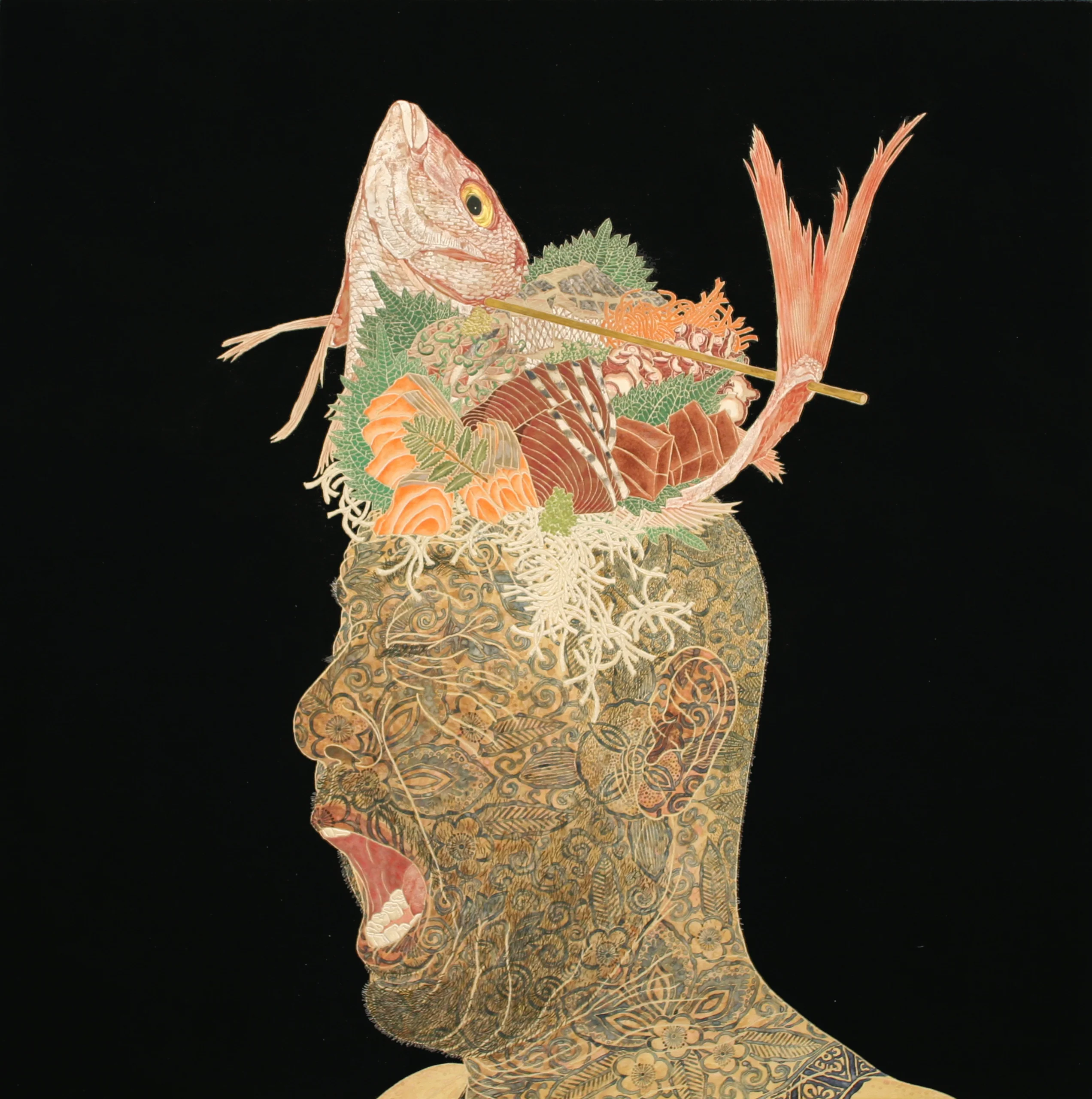 Experience Hiroomi Ito’s masterful fusion of tradition and innovation — handcrafted pigments, natural materials like tea and rice paper, and symbolic motifs that transform food and cultural icons into a deep visual dialogue.