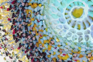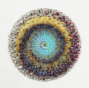 Like alchemy, Annalù’s swirling works capture the transition between the changing state of the material she has expertly learned to manipulate. The poetic chaos of nature is portrayed through swarms of butterflies, richly coloured carpets of flowers; metamorphic lyrical forms, suspended in space and time.